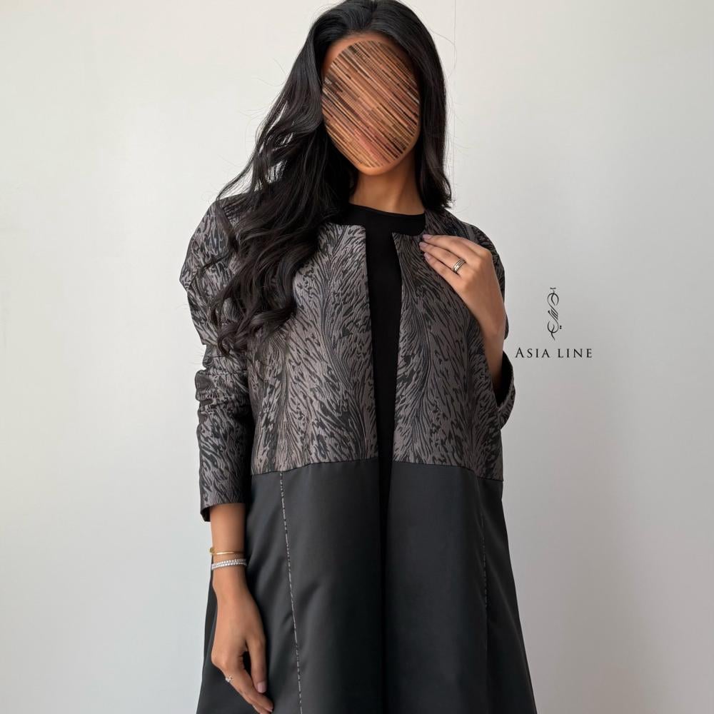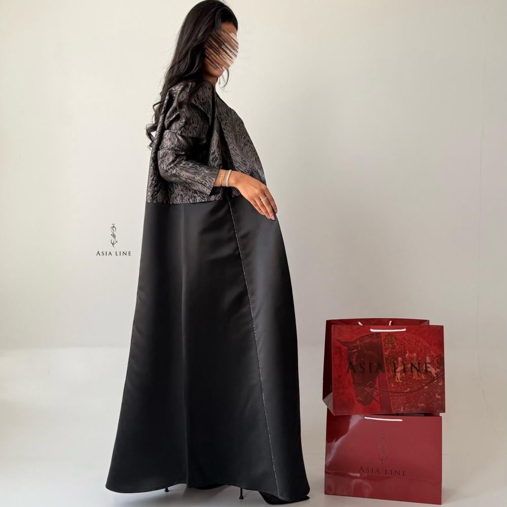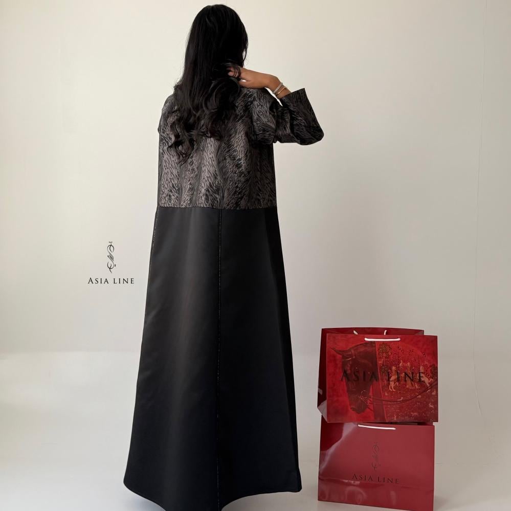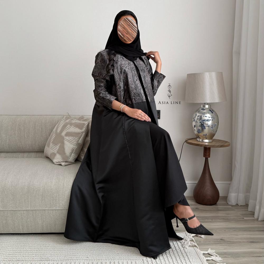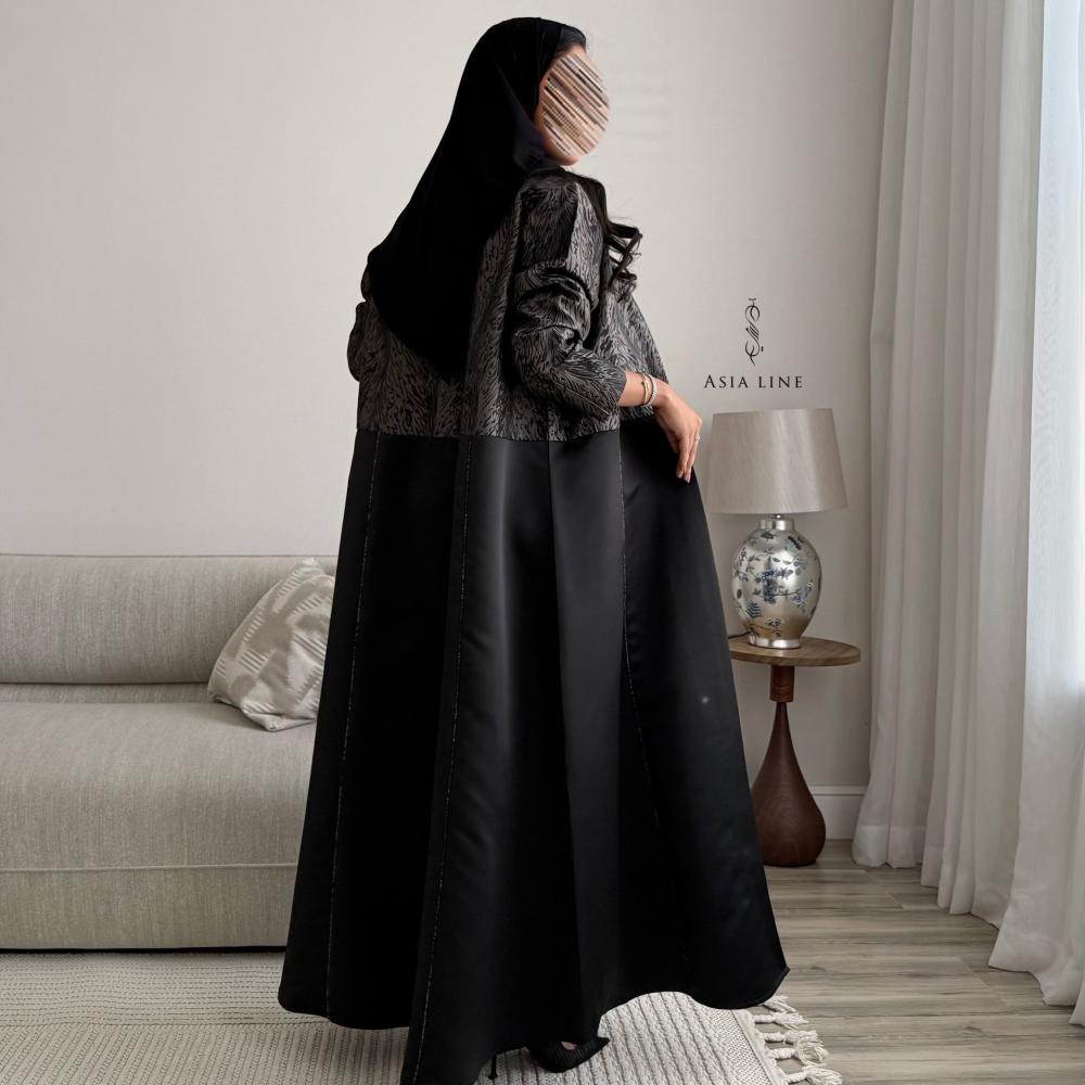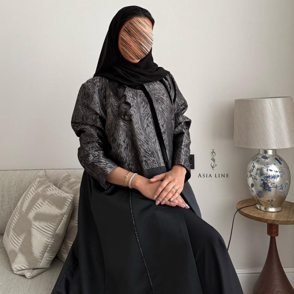 عباية تدمج بين البساطة والتفاصيل الناعمة، الجزء العلوي من قماش التفته المشجر يضفي لمسة أنثوية ناعمة تنسدل منه الأناقة في الجزء السفلي بتفته سادة تنطق بالهدوء والرقي.